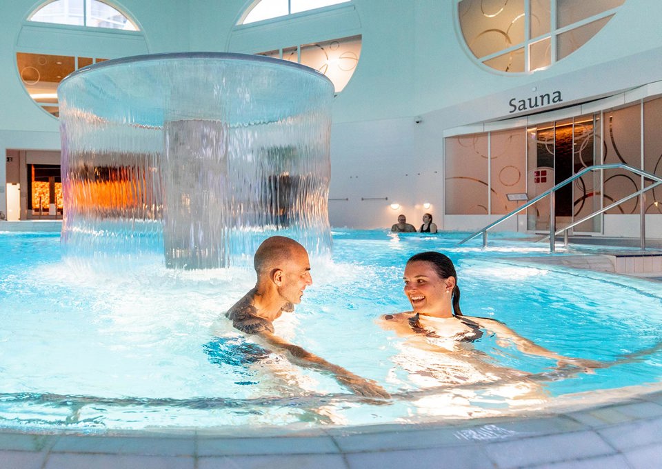 Durch unsere beheizte Passarelle gelangen Sie bequem im Bademantel ins Engadin Bad Scuol und die Therme. Auf 13'000 m² finden Sie Mineralquellen, eine Bad- und Saunalandschaft mit sechs Innen- und einem Aussenbecken, Solebad, Solarien, Dampfbad, Wechselbad und Ruhebereich.